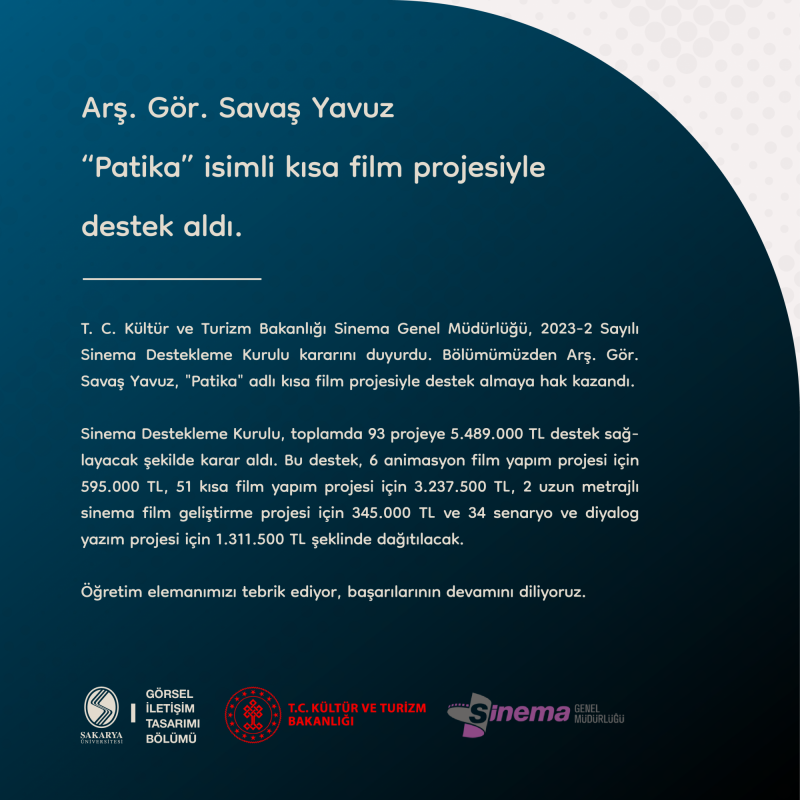 T. C. Kültür ve Turizm Bakanlığı Sinema Genel Müdürlüğü, 2023-2 Sayılı Sinema Destekleme Kurulu kararını duyurdu. Bölümümüzden Arş. Gör. Savaş Yavuz, "Patika" adlı kısa film projesiyle destek almaya hak kazandı.